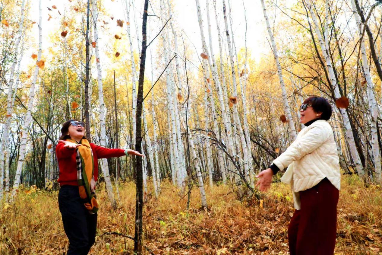 來自四川的游客沉浸在樺樹林的美景之中(王力 攝)